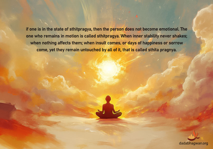 Param Pujya Dada Bhagwan, in very simple language, explains the essence of the state of a sthitpragya, saying that if one is in the state of sthitpragya, then the person does not become emotional. The one who remains in motion is called sthitpragya. When inner stability never shakes; when nothing affects them; when insult comes, or days of happiness or sorrow come, yet they remain untouched by all of it, that is called sthita pragnya. But the state of sthitpragya does not constantly produce Samadhi (a blissful state that comes about when one becomes free from mental, physical and externally induced suffering). Until the knowledge of one’s true Self arises, samadhi does not occur. When delusion falls away, then samadhi arises!